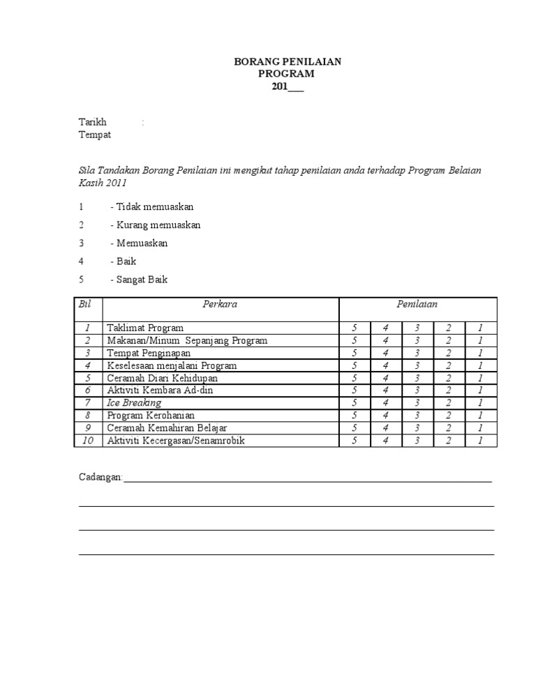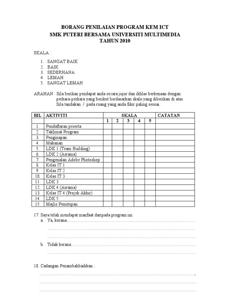 Borang Penilaian Prgm Borang Penilaian Kem Motivasi Dan Jati Diri Calon Spm 2015 Arahan Sila Tandakan Di Dalam Ruangan Yang Disediakan Berdasarkan Course Hero from www.coursehero.com Contoh borang kaji selidik kerja kursus pengajian am via www.slideshare.net. Skala seperti dibawah dan bulatkan pada nombor yang berkenaan tidak memuaskan kurang memuaskan memuaskan baik sangat baik 1 2 3 4 5 bahagian b : Use the download button below or simple online reader. Judul skripsi akuntansi instansi pemerintah. 1 mencapai skala 3.5 bagi penilaian tahap keberkesananpelaksanaan setiap program yang dilaksanakan. Peratus kompetensi adalah mengikut tanda tick yang telah. Jika ia tidak berkaitan maka anda perlu tanda x. Kualiti dan kebersihan makanan yang disediakan sepanjang.