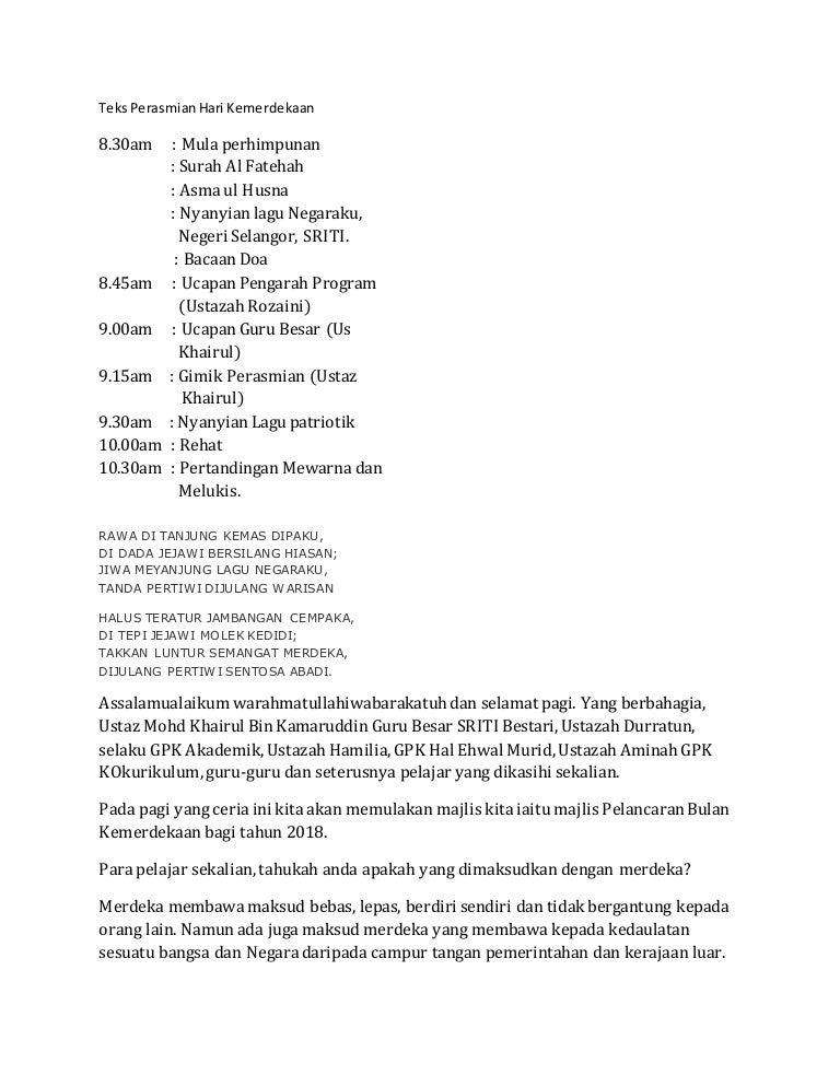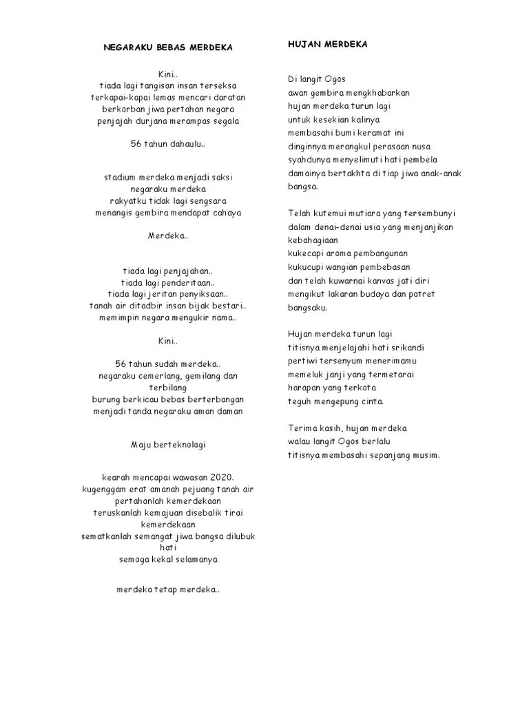 Sajak Kemerdekaan Malaysia from demo.fdokumen.site Tapi hujan selalu tertahan dalam topan. Sajak negaraku merdeka ( johan). Koleksi video bebas merdeka terbaru. Lagu terang bulan, yang berasal dari pulau mahé di kepulauan seychelles dan diadopsi oleh sultan abdullah setelah pulang dari pengasingan di seychelles. Bebas merdeka taken from album the other side steven & coconuttreez. September 10 at 1:55 am ·. Pewaris amanah karya razali mohamad yussof. Siang nan indah, malam yang permai, bumi bertuah, subur dan damai, di sini tanah, tumpah darahku, bebas merdeka, bersatu dan maju, berkibar megah, panji negara, selatan, timur, barat, utara
