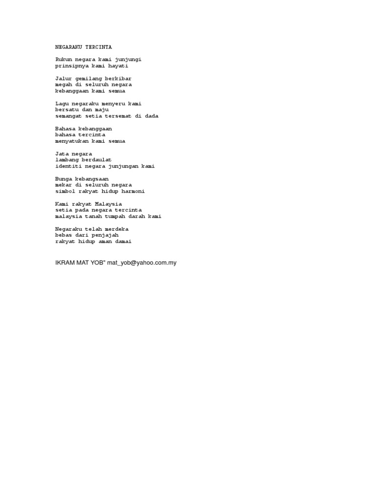Negaraku Tercinta from imgv2-1-f.scribdassets.com Disebut bebas karena sajak tidak terikat oleh aturan seperti pada jumlah baitnya, jumlah suku katanya, dan persamaan suara pada ujung di setiap barisnya. Negaraku tetap merdeka kerana ada anak malaysia berbangga dengan negaranya berjuang hingga ke akhir nafasnya. Salam kemerdekaan dr zambry a. Steven coconut treez one nada music cp 082340110304 (widi prasetyo) sound. September 10 at 1:55 am ·. Bebas merdeka taken from album the other side steven & coconuttreez. Bersandar mak tua, tak peduli lalu lalang di jalan apalagi ngomongi malinda dee yang di ganjar delapan tahun mungkin ianya juga lebih tak peduli jikalau pak sby bilang, indonesia bebas korupsi. Sajak negaraku merdeka ( johan).
